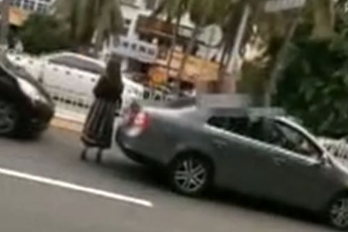 海口一女司机等红灯时 遭后车男女当街扇耳光丢垃圾
