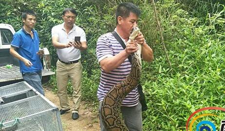 实拍三亚野保站人员放生两条家养十余年的大蟒蛇