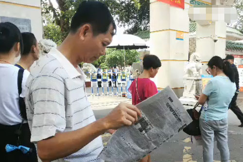 海中高考考场外 男子等待女儿出考场也不忘看报学习
