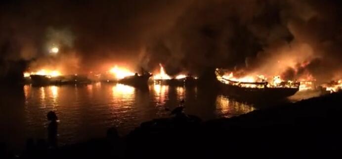 网友实拍临高18艘渔船起火现场 消防渔政联合扑救
