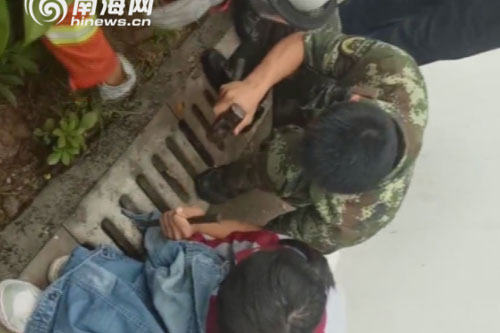 海口:帮同学捡钢笔 一女生手被卡排水沟缝隙